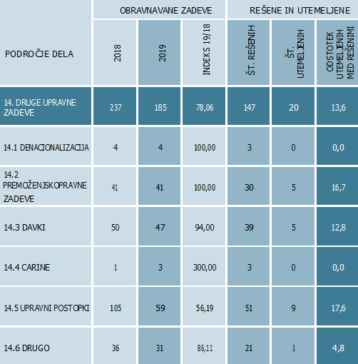 V letu 2019 smo v obravnavanem sklopu, kamor uvrščamo upravne zadeve, ki ne spadajo nikamor drugam, obravnavali nekoliko manj zadev kakor leto prej. Tudi odstotek utemeljenih zadev, kjer smo prepoznali kršitve človekovih pravic ali druge nepravilnosti, ki so jih povzročili organi oblasti, je bil v tem letu manjši, in sicer je bil na skupni ravni 13,6-odstoten. Ocenjujemo, da primerjava števila obravnavanih zadev in odstotkov s kršitvami ni smiselna, saj ne gre za velike razlike, ki bi to zahtevale, poleg tega gre za področje, kjer je letni pripad precej odvisen od načina evidentiranja posamezne obravnavane vsebine. Ne nazadnje to izhaja že iz poglavja Druge zadeve. Ker gre za zelo raznoliko področje, je nujno poudariti, da so v poročilo vključena le najpomembnejša vprašanja, poudarki in ugotovitve Varuha, torej vse tisto, kar je zadevalo večje število posameznikov ali ostaja nerešeno že več let in je tudi zato potreben resen razmislek o nujnih spremembah.