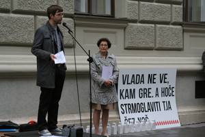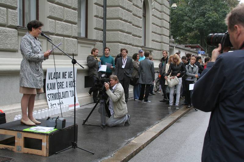 Ljubljana, 4.10.2012 (STA / VČP) - Predstavniki Centra za informiranje, sodelovanje in razvoj nevladnih organizacij (CNVOS) so pred stavbo vlade začeli s protestnim javnim branjem resolucije o normativni dejavnosti. Branje, ki bo trajalo do 12. ure, je z uvodom v resolucijo simbolično začela varuhinja človekovih pravic dr. Zdenka Čebašek - Travnik.