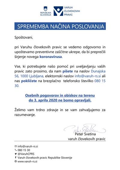 Varuh človekovih pravic pozorno spremlja razmere v zvezi s koronavirusno boleznijo v Sloveniji in tujini ter ukrepe, ki jih državni organi...